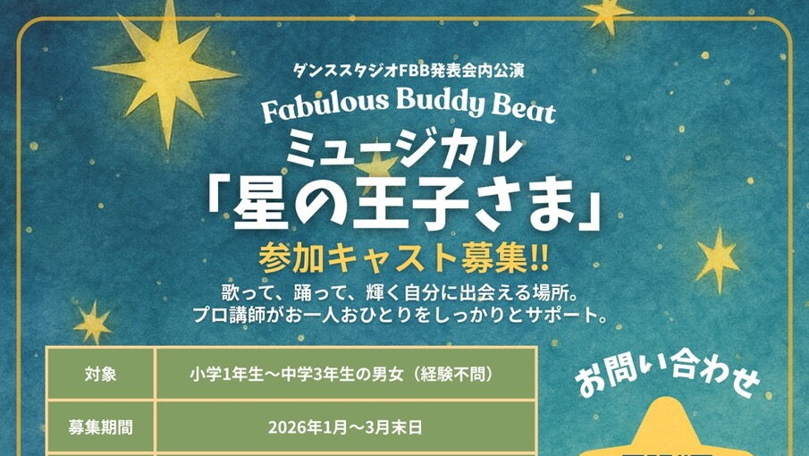 ダンススタジオ【FABULOUS BUDDY BEAT】ミュージカル「星の王子さま」出演者募集 イベント 2026.02.14 このコンテンツはパスワードで保護されています。閲覧するには以下にパスワードを入力してください。 パスワード: