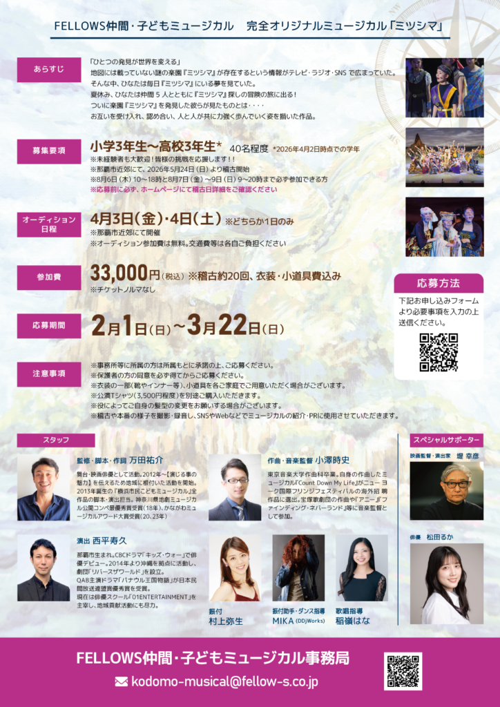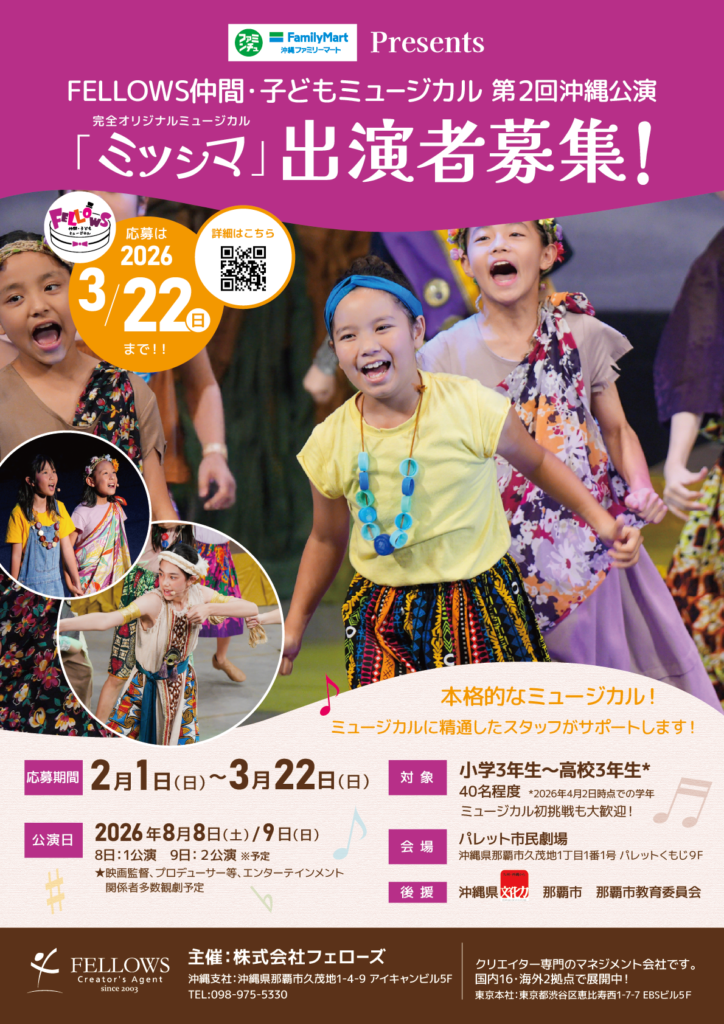 株式会社フェローズ主催で、2026年8月8日(土)・9日(日)に上演の【FELLOWS仲間・子どもミュージカル第2回沖縄公演「ミツシマ」】が出演者を募集しています。